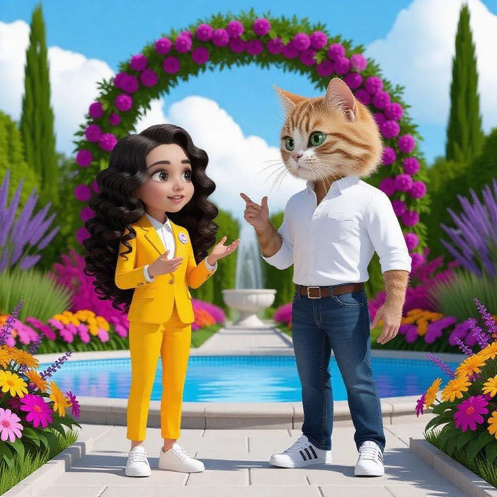 Create a magical park scene with AI-generated 3D rendering: a girl in yellow and a whimsical cat-headed man discuss under a floral arch. Vivid natural elements include cypress trees, a serene pool, and soft daylight. Perfect for surreal storytelling visuals. Transform your ideas into stunning, peaceful fantasy landscapes with Vivago.ai's advanced AI image generation tools.