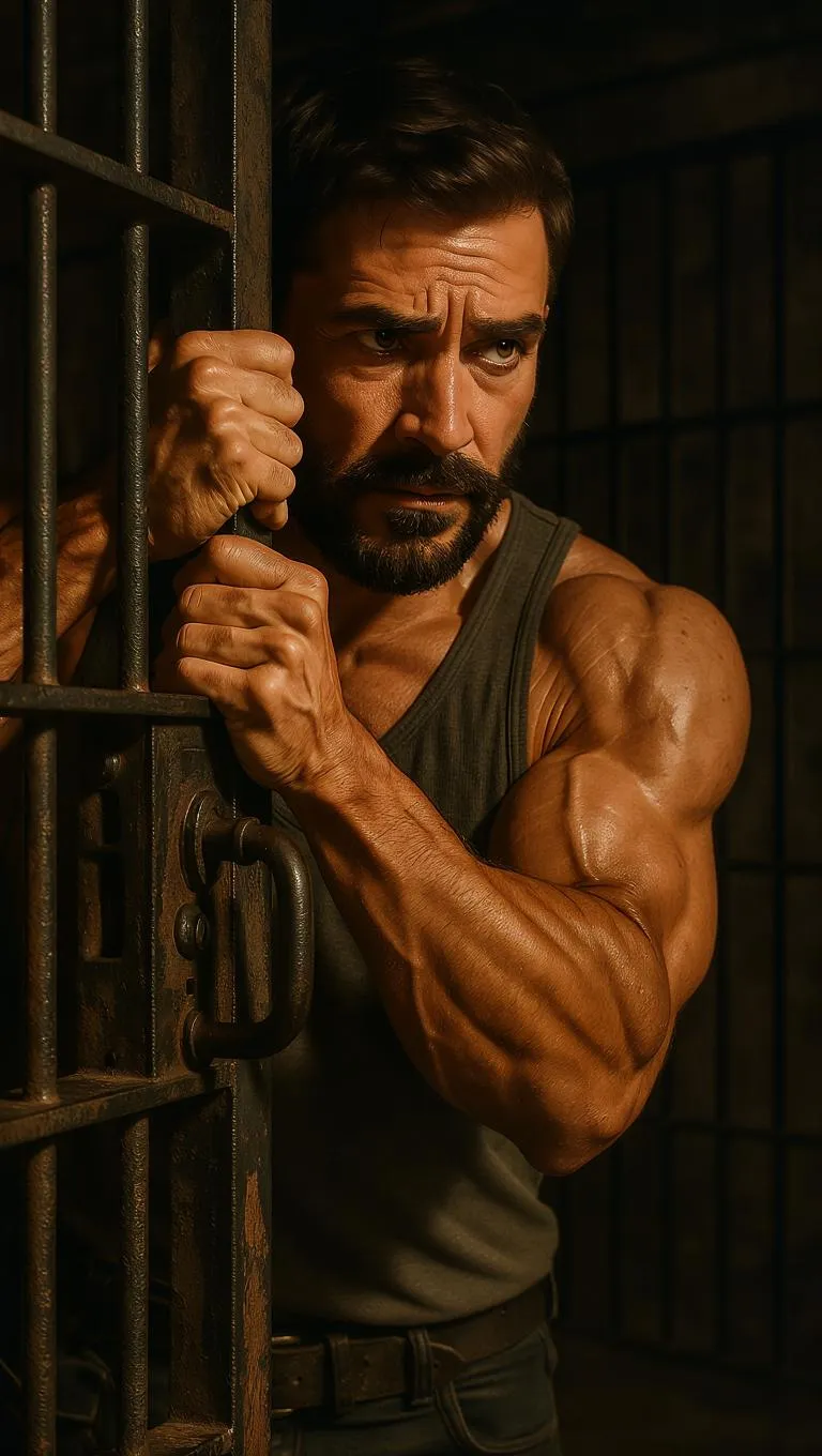 Generate a cinematic AI scene of a muscular man pushing open a heavy prison door, capturing his hopeful determination and weary expression. Dark cell interior contrasts with dramatic escape symbolism. Ideal for filmmakers and creators seeking intense, anticipation-driven visuals with professional-grade AI-generated realism.
