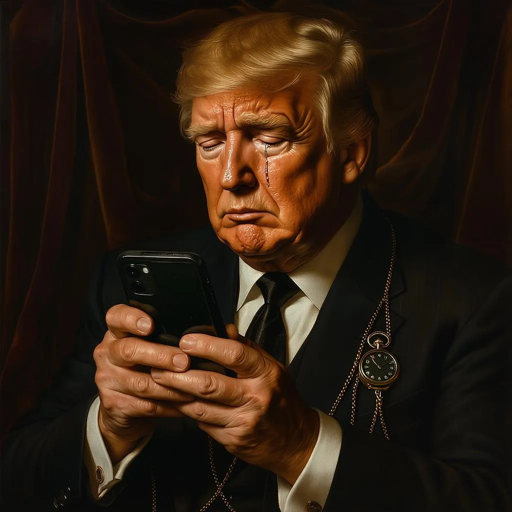 AI-generated Baroque-style portrait of Donald Trump tearfully contemplating Elon Musk's unanswered message. Ultra-photorealistic 8K details: chiaroscuro lighting, cracked phone reflections, tear-streaked wrinkles. Symbolic velvet drapes and pocket watch chains evoke timeless agony. Perfect for AI art enthusiasts seeking dramatic emotional narratives and hyper-realistic textures. Explore AI image generation for historical satire or modern celebrity storytelling with creative AI tools.