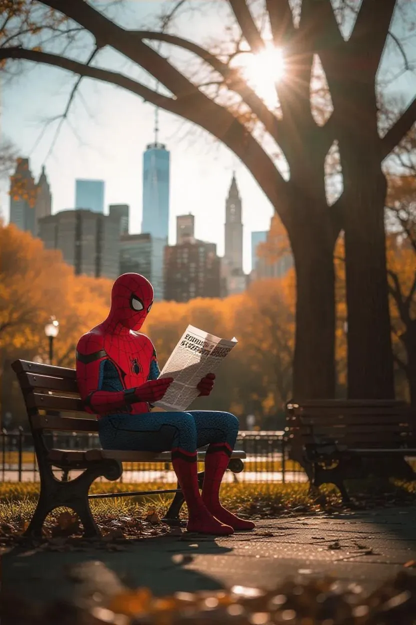 Spiderman casually reading a newspaper on a park bench, morning sunlight filtering through the trees, casting dappled shadows. The city skyline visible in the distance, adding a sense of urban serenity. Photography captures the relaxed superhero in a candid moment.