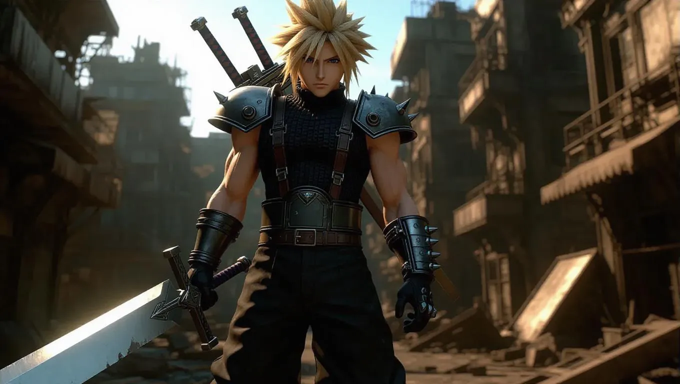 Cloud Strife navigating the desolate ruins of post-apocalyptic Midgar, his massive Buster Sword slung over his shoulder. Iconic spiky hair and black-and-blue outfit, goggles pushed up on his forehead. Determined expression as he searches for hope. Background filled with crumbling buildings, twisted metal, and eerie remnants of Shinra's failed experiments, casting long shadows in the dim light.