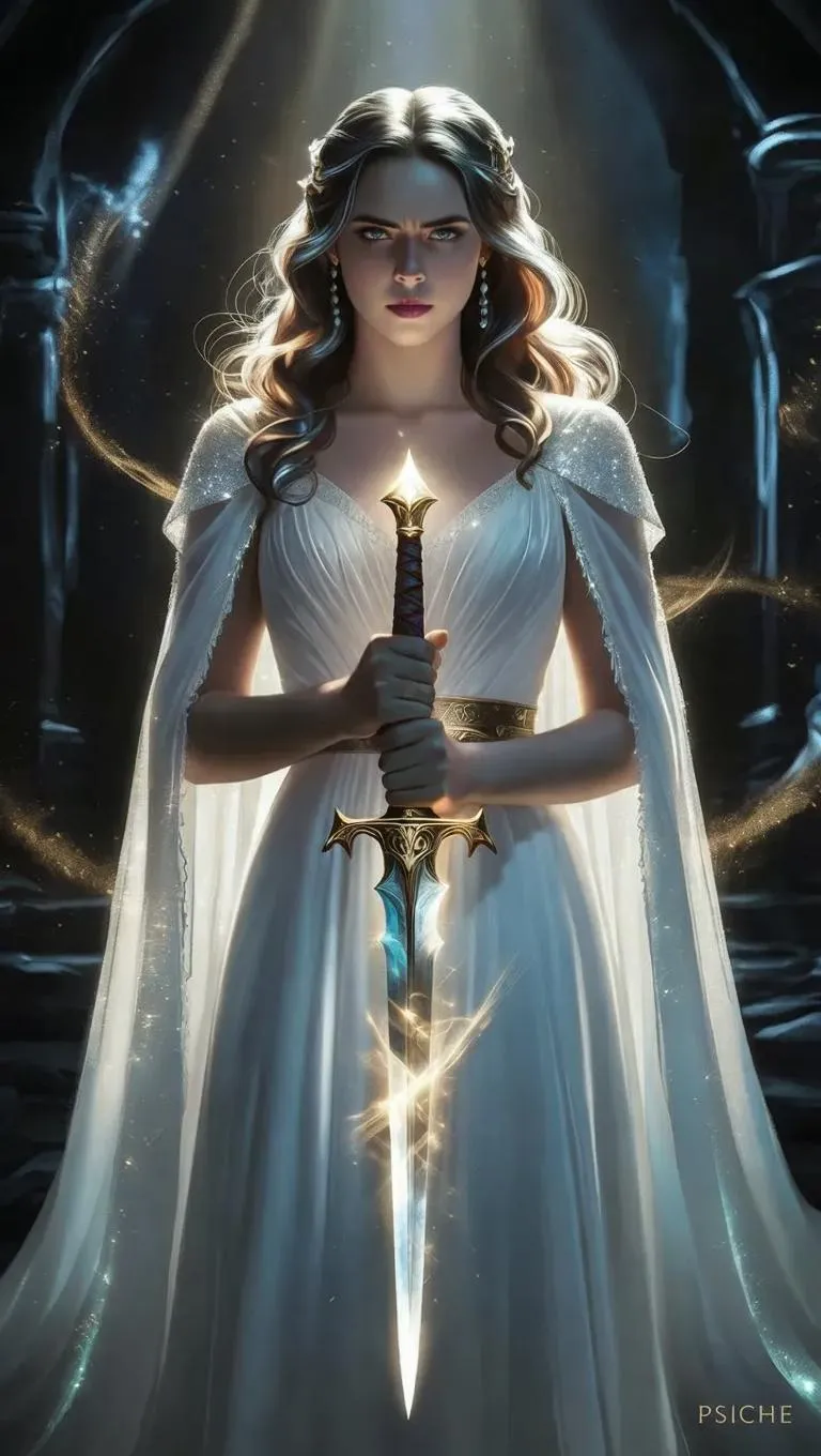 In a dimly lit, ethereal setting, the enigmatic figure of Psiche stands, her white gown shimmering with an otherworldly glow. A divine light illuminates her, casting long, dramatic shadows. Her aggressive and uncertain expression is etched on her face as she clutches a glowing dagger, its blade straight and sharp. The image is rendered in vivid, realistic colors, with no words or writing to distract from the intense, emotional scene.