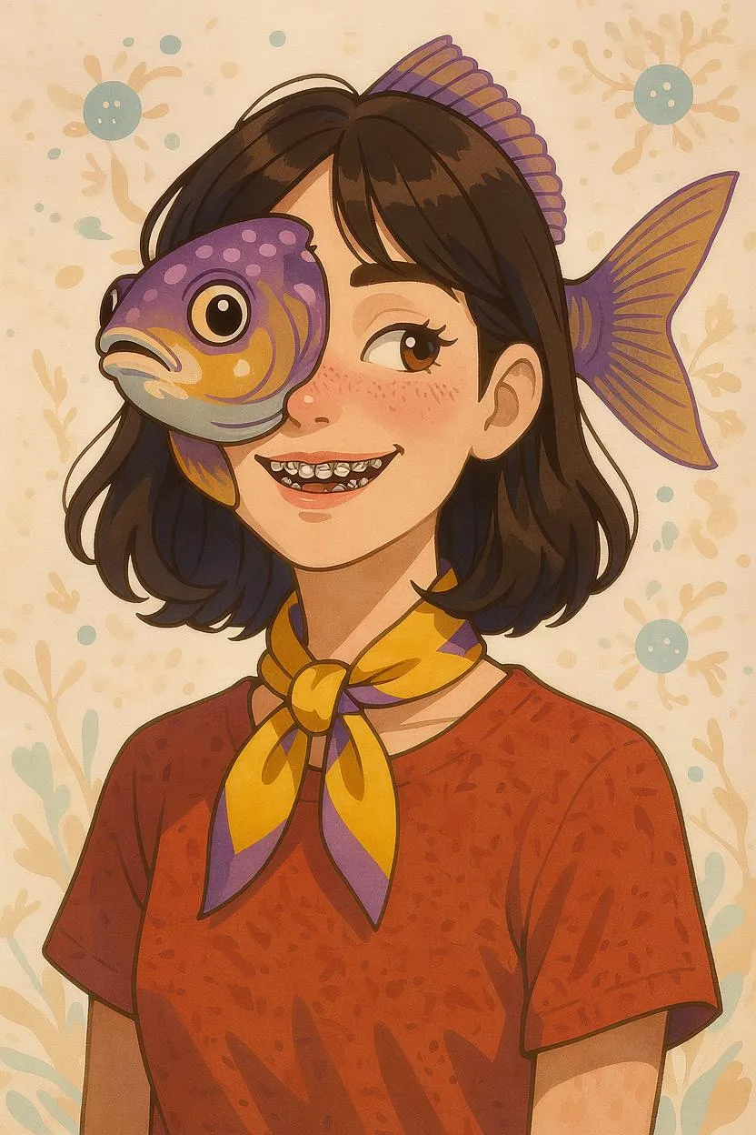 A surreal, stylized animated video features a young woman with shoulder-length hair swept to one side, wearing a red shirt and a loosely tied yellow-and-purple foulard from El Cau around her neck. Her head is an artistic fusion of a Glovo fish and a human face, with gentle features, expressive eyes, and braces, more human than fish, adorned with subtle aquatic textures. The scene is softly lit with pastel backgrounds, fluid motion, and a dreamy, contemporary Catalan-inspired art style, emphasizing smooth transitions and emotional nuance.