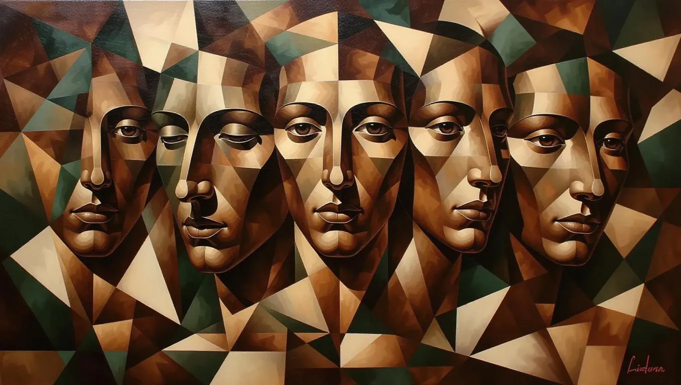 Cubist-style oil painting featuring bronze faces in fragmented geometric backgrounds with intersecting planes. Analytical Cubism showcases sharp angles, mechanical forms, and overlapping polygons in earthy brown, green, and ochre. Visible oil brushstrokes, canvas texture, and multifaceted spatial depth evoke early 20th-century Cubist artistry.
