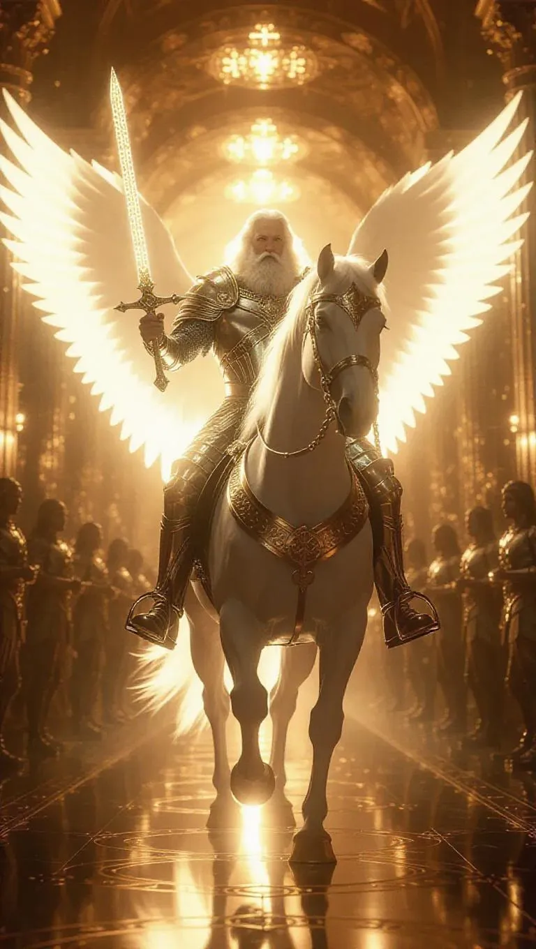 Experience Metatron's divine majesty with vivago.ai's AI image tools. Ultra-realistic 4K rendering depicts the celestial scribe astride an armored steed, flaming sword blazing sacred runes through heaven's golden halls. Cinematic lighting highlights wings of white flame and divine armor, crafting biblical epics with surreal holy atmosphere. Transform text into awe-inspiring angelic visions powered by AI creativity.