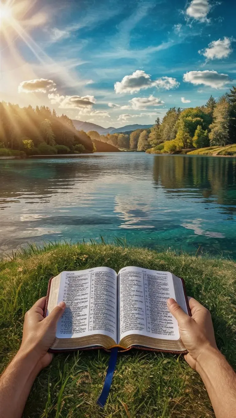 Generate hyper-realistic AI images of a young man holding an open Bible on lush grass with a serene lake backdrop. Perfect for spiritual, nature-themed content. Vivago.ai transforms text prompts into stunning visuals with lifelike details, ideal for faith-based creators seeking professional AI image generation and editing tools for impactful storytelling.