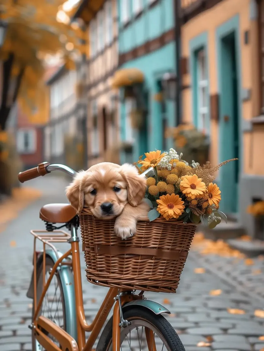 Create a cozy autumn scene with an AI-generated image of a sleepy beige puppy in a rustic bicycle basket. Vibrant fall leaves, cobblestone streets, turquoise houses, and warm lighting blend into a detailed wide-angle photo, capturing cute, atmospheric seasonal charm through AI art and creative effects.