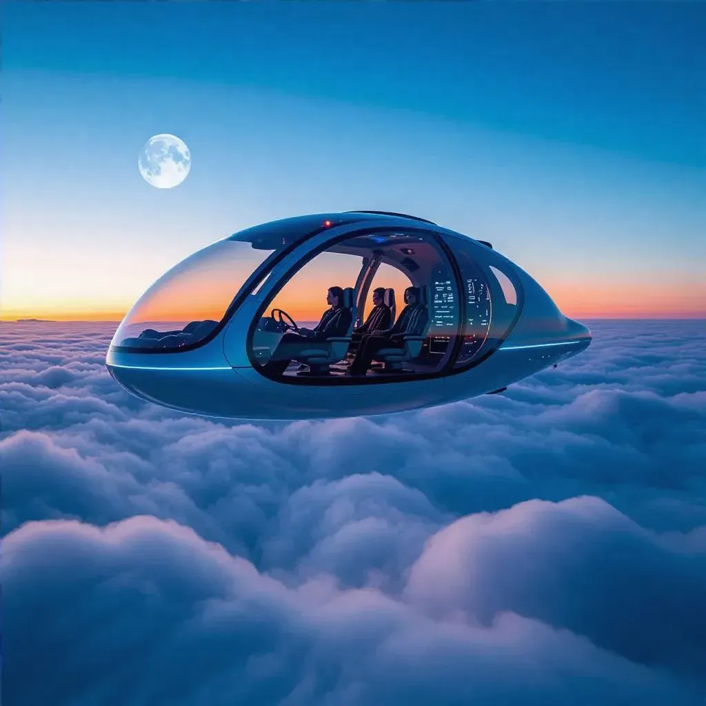 Generate a futuristic AI aircraft scene with silvery-blue tones and panoramic windows. Depict an autonomous cabin with illuminated controls, two passengers above luminous clouds under a moonlit evening sky. Soft, diffused lighting enhances depth in this AI-generated image. Perfect for sci-fi visuals, created via vivago.ai's advanced AI art tools for ethereal aviation-themed digital content.