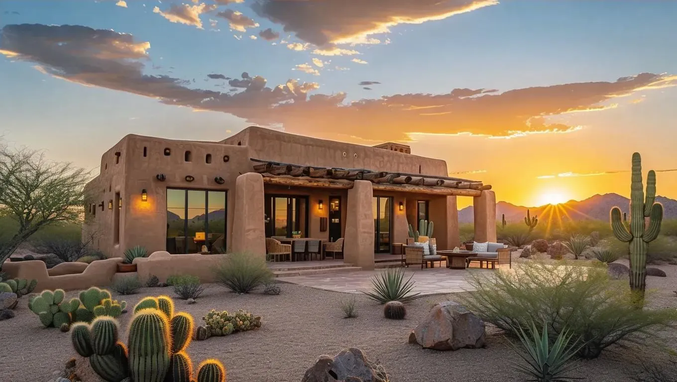 Generate AI visuals of Southwestern-style desert house architecture with adobe walls, terracotta roofs, and earthy tones. Explore AI-generated designs blending rustic wooden beams, sand-inspired textures, and shaded patios. Perfect for creating authentic desert homes harmonizing with arid landscapes. Ideal for architects or homeowners seeking AI-powered Southwestern aesthetic inspiration.