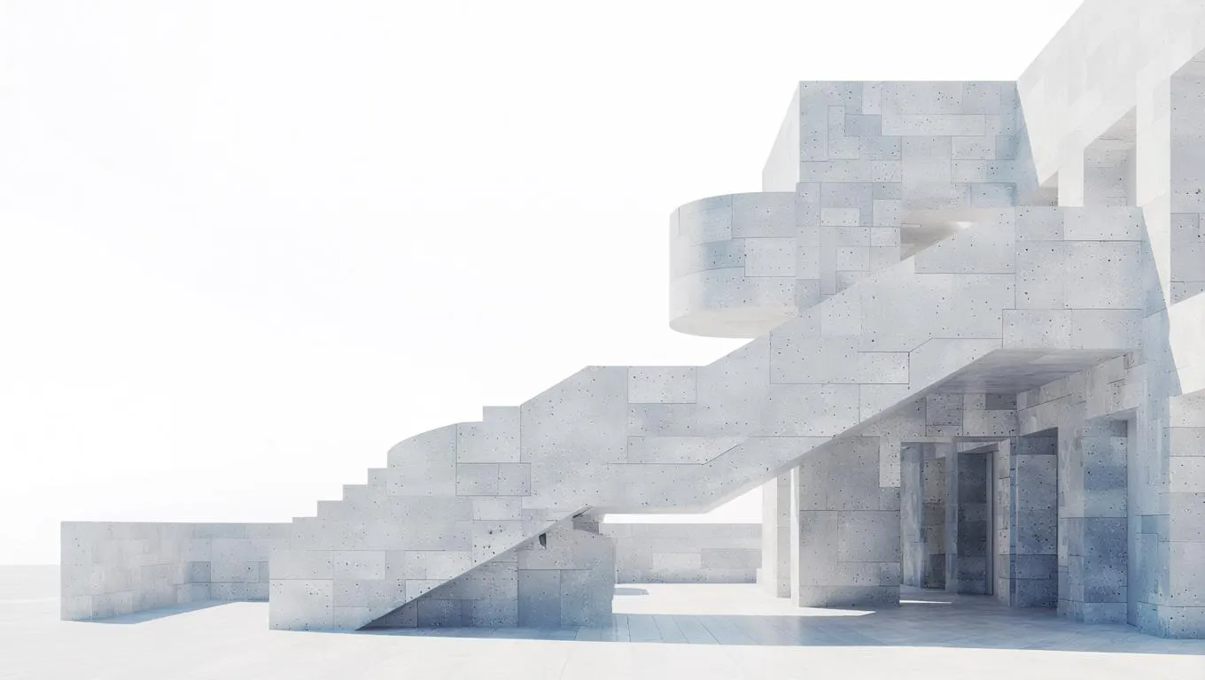 Create modern AI-generated images of geometric white concrete buildings with sleek staircases and curved structures against moody skies. VivaGo.ai transforms text prompts into striking architectural visions with precision. Try our AI image generator for visually impressive geometric concrete designs.