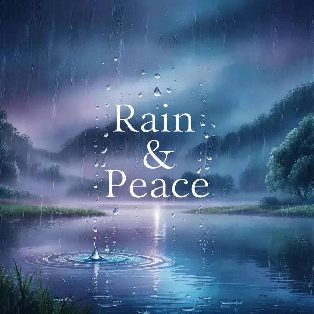 Generate a serene rainy night scene with AI. Gentle raindrops ripple calm waters under glowing blue-purple skies, enhanced by subtle mist. Minimalist "Rain & Peace" typography blends seamlessly, creating tranquil visual storytelling for peaceful ambiance and atmospheric digital art.