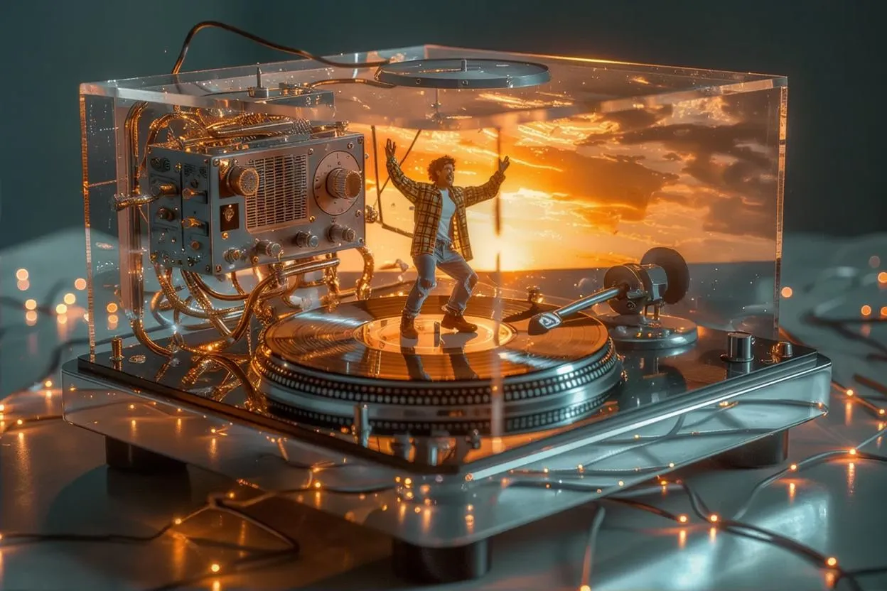 Transform text into hyper-realistic AI visuals with vivago.ai. Generate vintage glass-chrome turntables, 90s grunge aesthetics, cinematic sunset lighting, and holographic reflections. Perfect retro-inspired imagery with LED ambient glows, polished mechanics, and Ilford film texture. Ideal for surreal, detailed scenes blending nostalgia and futurism in minimalist studio settings.