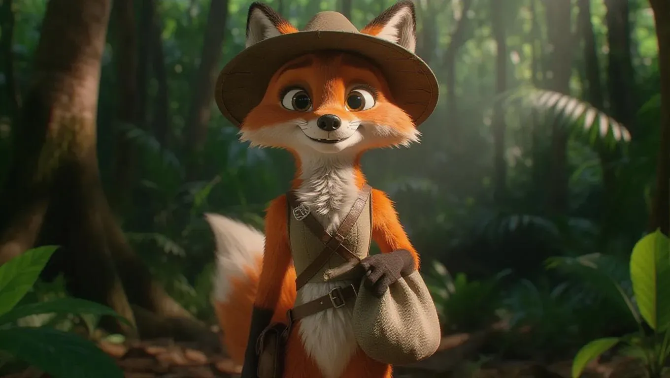 3D cartoon front view of a clever female fox standing in the jungle, orange fur, white chest, wearing a small hat and carrying a cloth bag at her waist, confident smile, bright eyes, forest background, Pixar-style lighting, soft shadows, high quality.