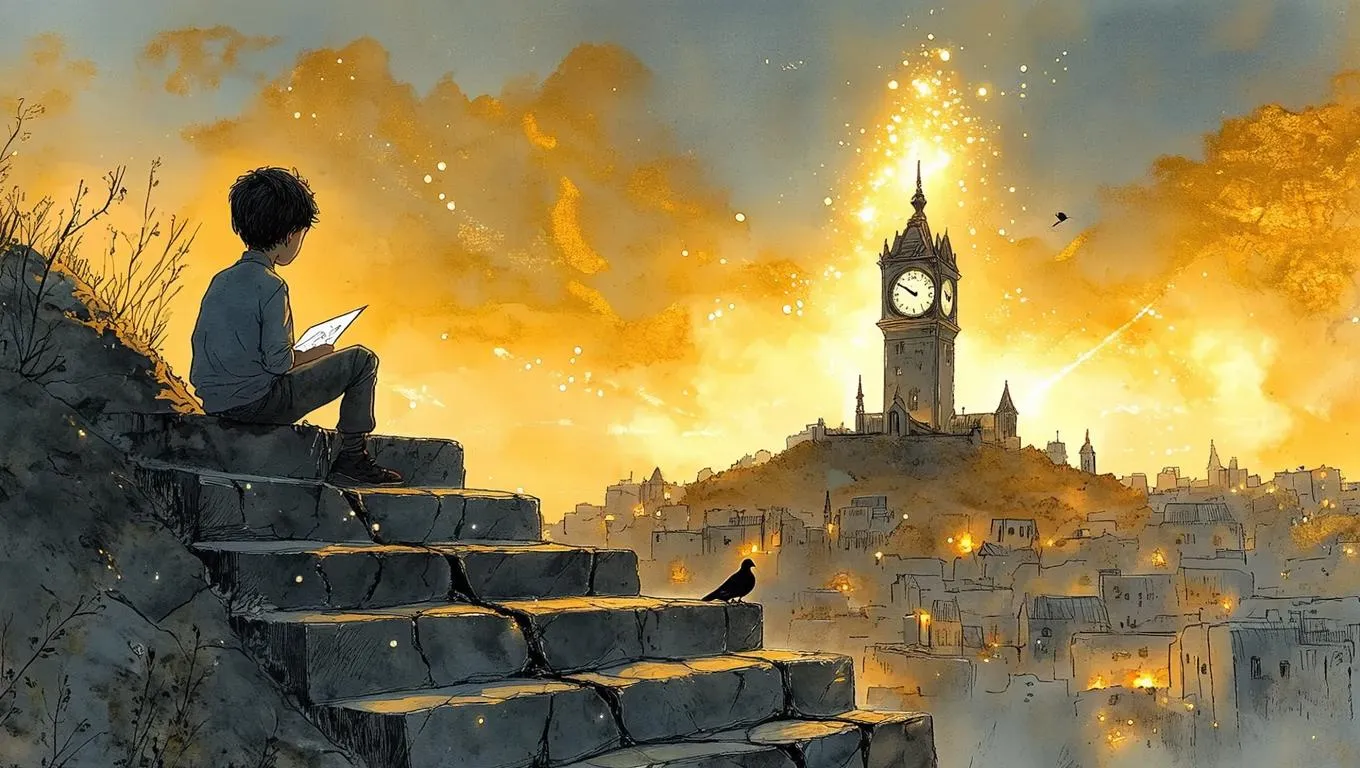 Create AI-generated anime art with cinematic watercolor scenes using Vivago.ai. Transform prompts into radiant, golden-ink effects and glowing textures. Craft nostalgic storytelling visuals—fading lines, glowing clocktowers, and ethereal skies. Perfect for cinematic anime styles, memory-inspired art, and professional-grade watercolor edits. Elevate creativity with AI-powered golden ink and glowing effects.