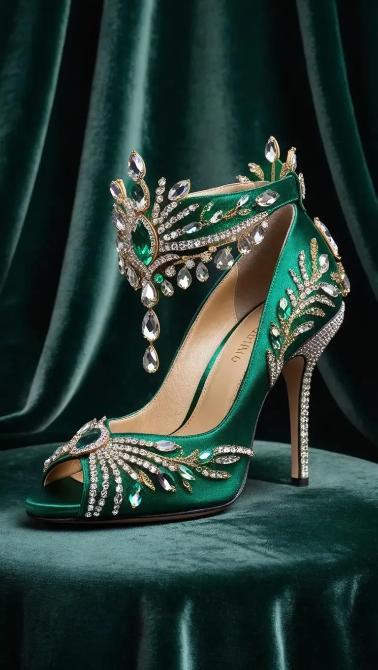 Create enchanting AI-generated green princess heels with emerald elegance & crystal details. Design fantasy-inspired footwear using Vivago.ai's AI effects for magical charm. Ideal for fairy tale themes, fantasy wardrobes, or editorial projects. Customize magical shoe designs with text-to-image prompts for ethereal results.