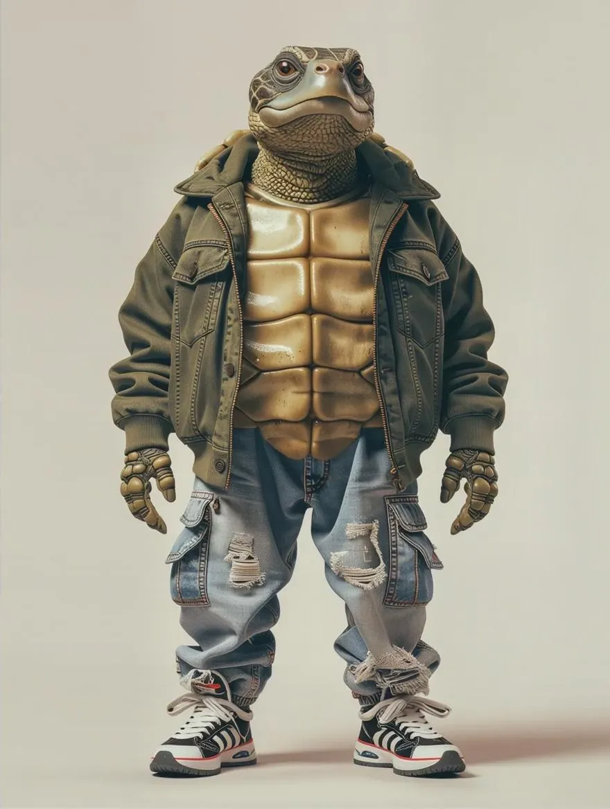 Anthropomorphic tortoise standing on two legs wearing streetwear clothes, full-length head-to-toe shot, neutral background. Hyperrealistic style