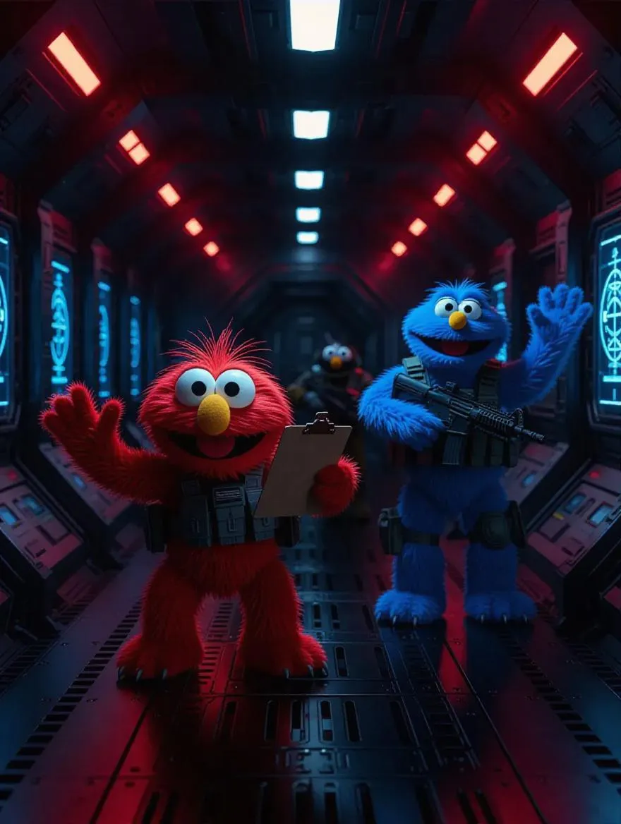Ultra-detailed sci-fi military spaceship corridor with holographic maps, armored marines, and cinematic realism clashes humorously with cheerful 2D-style fuzzy monsters, a clipboard-wielding red creature, and chaotic alien explosions. Seamlessly merging hyper-realistic metallic environments with vibrant animated characters for a surreal, high-contrast visual narrative blending cinematic sci-fi and whimsical cartoon chaos.