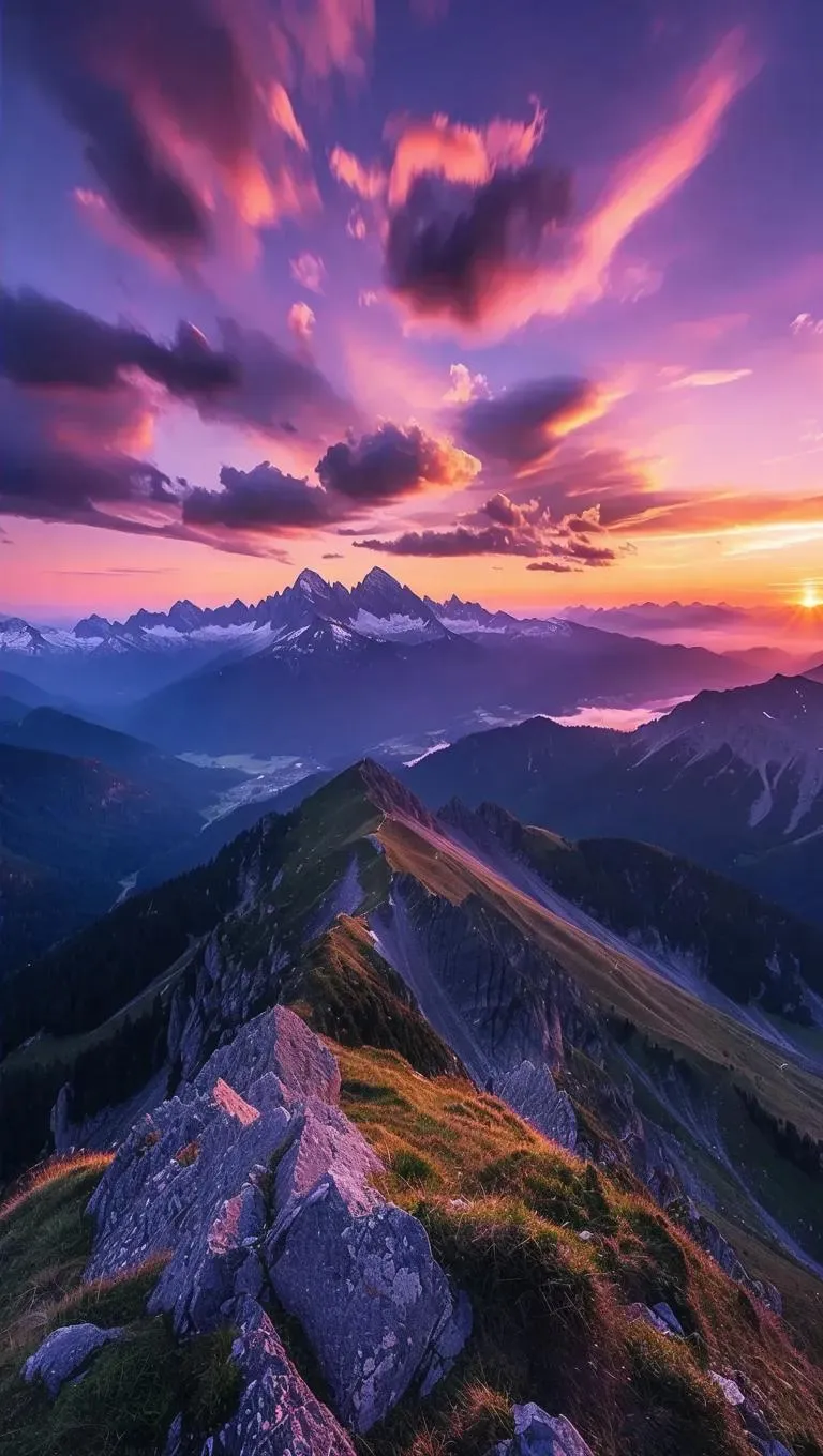 Capture the serene beauty of a majestic mountain peak at dusk with vibrant purple-red sunset hues. AI-generated landscape art transforms text into vivid evening skies, crisp mountain air, and awe-inspiring natural vistas. Elevate your creative projects with professional-grade visuals.