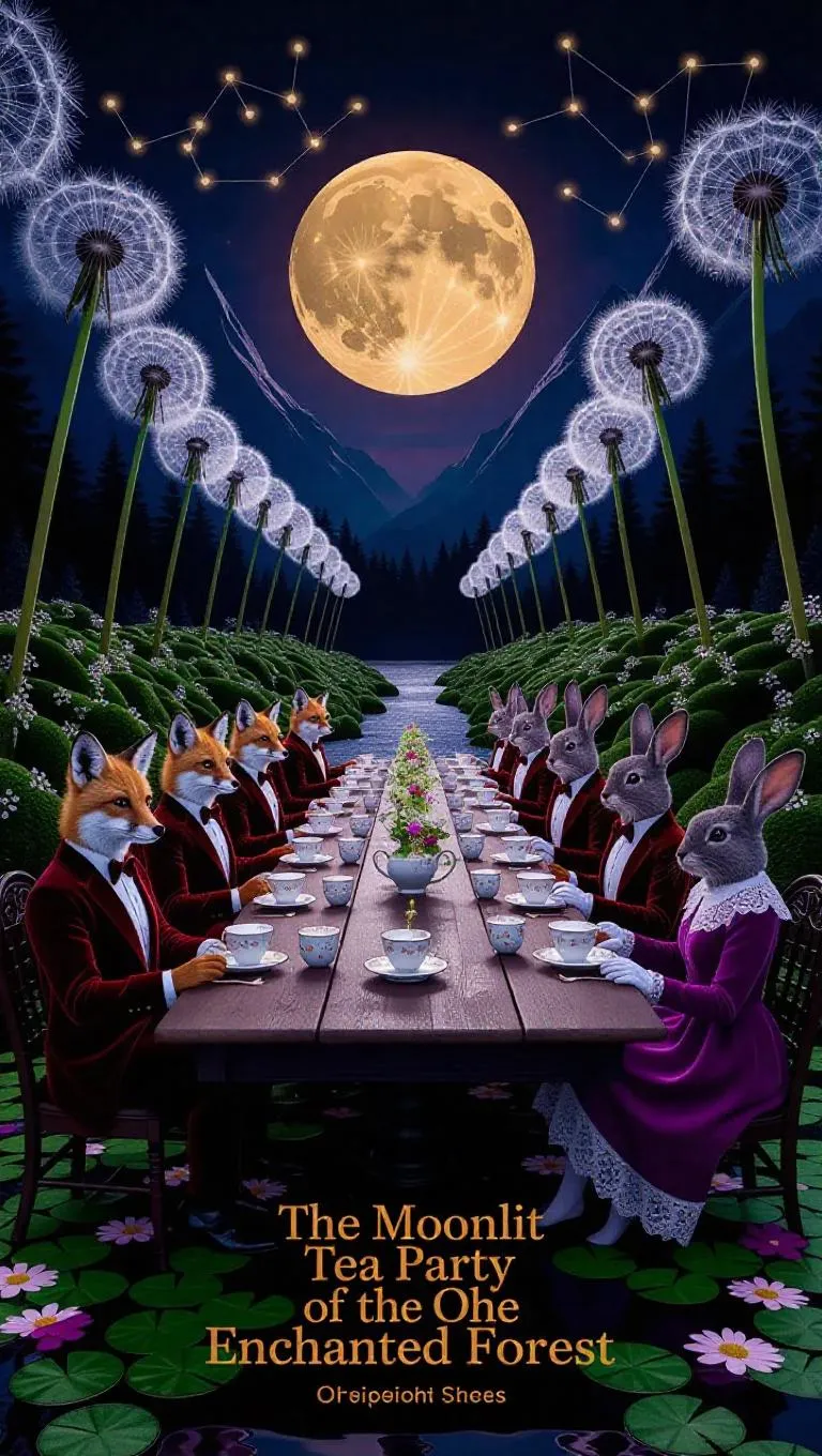 "The Moonlit Tea Party of the Enchanted Forest" Deep within a glowing forest of towering dandelion trees and luminescent crystal moss, a long wooden table stretches over a lily-covered river. Foxes in velvet jackets, owls with gold-rimmed glasses, and rabbits in lace collars sip tea from floating porcelain cups. Fireflies dance above, casting ethereal light as the oversized, honey-colored moon hangs low between mystical mountain silhouettes. Every leaf whispers a lullaby, and the sky shimmers with slow-moving constellations shaped like ancient tales.
