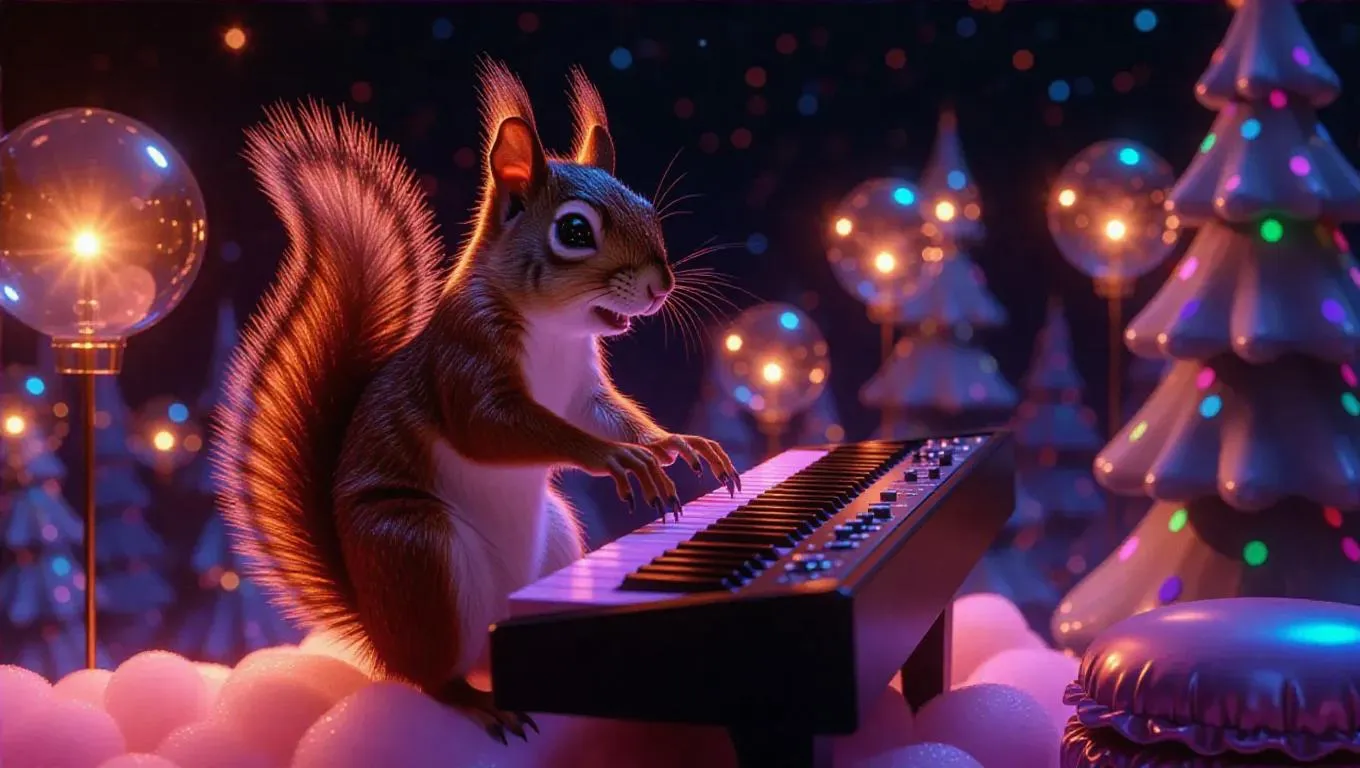 Create a vibrant, AI-generated fantasy scene with a glittery squirrel playing a synth piano on a macaron rooftop. Experience dreamy digital art featuring candy-colored skies, stardust effects, bubblegum nebula, and whimsical plushie birds. Perfect for surreal AI art, neon creature designs, and imaginative visual storytelling with Vivago.ai's creative tools.