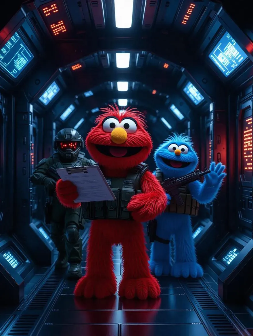 A hyper-detailed sci-fi military spaceship corridor with advanced metallic surfaces, dim emergency lights, wall panels displaying holographic maps, and armored marines wielding futuristic rifles. High-budget movie look, dark tones, chrome reflections, cinematic realism. In the midst, a cheerful, fuzzy red monster with huge googly eyes holds a clipboard and smiles, resembling a Sesame Street character. A blue fuzzy monster waves happily, while a bug alien explodes dramatically behind them. Ultra-detailed cinematic sci-fi environment contrasts with soft, colorful 2D-like animated characters, creating a surreal blend of styles.