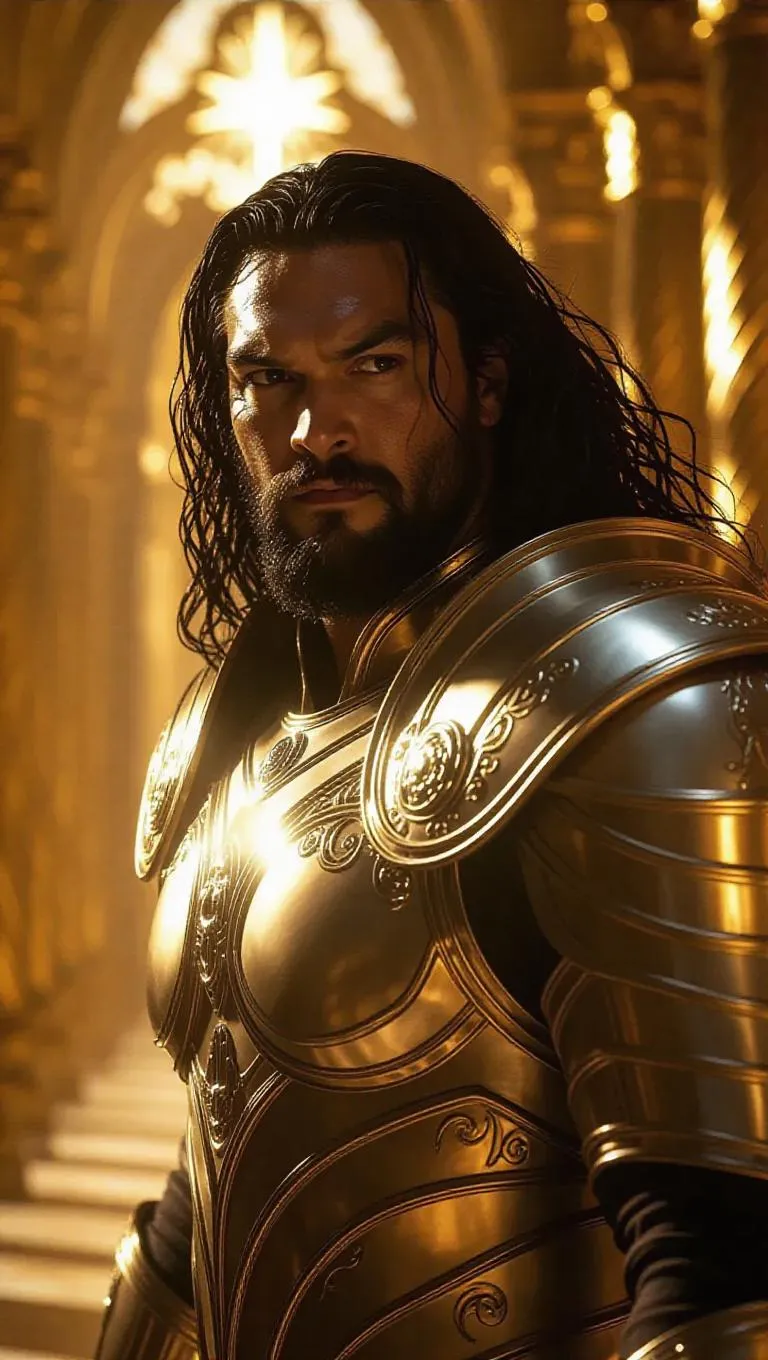 Hyper-realistic AI-generated image of Jason Momoa as Archangel Raphael in cinematic 4K detail. Radiant celestial armor with glowing runes, fierce gaze, and flowing hair amidst Heaven's golden halls. Divine golden lighting highlights intricate armor textures and heavenly architecture. Perfect for fans of hyper-detailed angelic warriors, celestial aesthetics, and AI-powered cinematic character design.