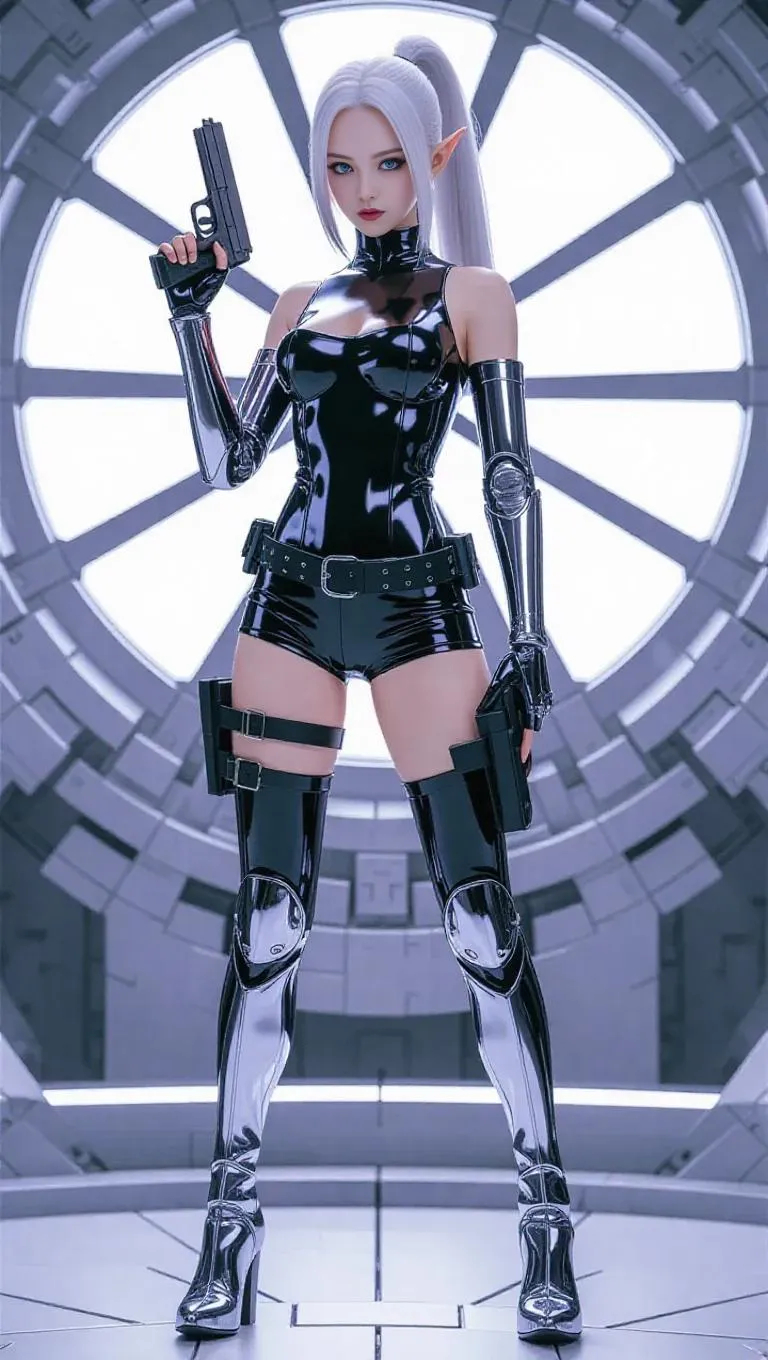 (masterpiece, best quality, ultra-detailed), full body, wide shot. 18 years old. Young elf girl in a tight sleeveless black latex suit with embedded high silver heels knee boots. Shiny silver metallic arms from shoulder to fingers, with visible joints, reflecting robotic nature and enhancing mobility and combat. Pale, striking face with white hair, undercut, low tressed ponytail, piercing bold blue eyes. Dark gothic makeup, black lipstick, contrasting flawless skin. Busty breasts, slender waist, pert hips, busty thighs accentuated by form-fitting suit. Pistol in thigh-mounted holster, ammunition belt. Holding ultra-thin plasma katana, humming with deadly energy, in dynamic ready-to-fight pose. Neon-soaked cyberpunk metropolis. Intense gaze directed at viewer.