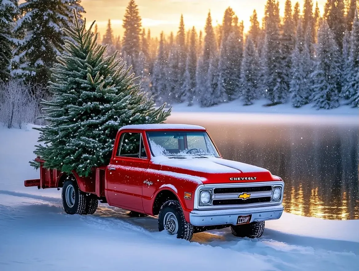 Create an AI-generated winter scene with a vintage red Chevrolet C50 flatbed truck holding a Christmas tree by a snow-covered lake. Golden hour light, frosty pines, and falling snowflakes enhance the magical, cozy ambiance. Perfect for holiday visuals using Vivago.ai's AI image tools.
