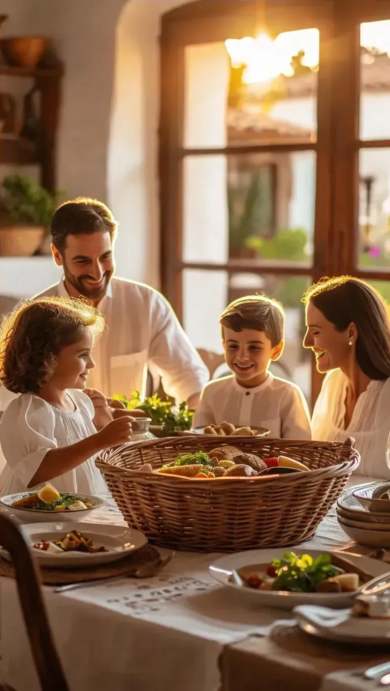 Generate an AI image of a traditional Portuguese family meal with a vibrant food basket on a rustic table, bathed in soft ambient lighting. Create authentic cultural scenes instantly using vivago.ai's advanced AI tools for lifelike textures, warm atmospheres, and professional-grade visual storytelling. Enhance your creative projects with AI-powered realism.