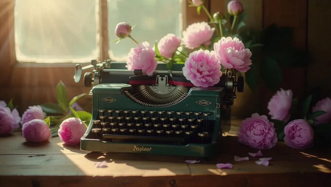 An antique typewriter with lovely peonies sprouting from the keys and carriage, creating a splendid combination of vintage charm and natural beauty. The typewriter rests on a wooden countertop, surrounded by bright, playful sunlight dancing through leaves, enhancing the soft and magical atmosphere.