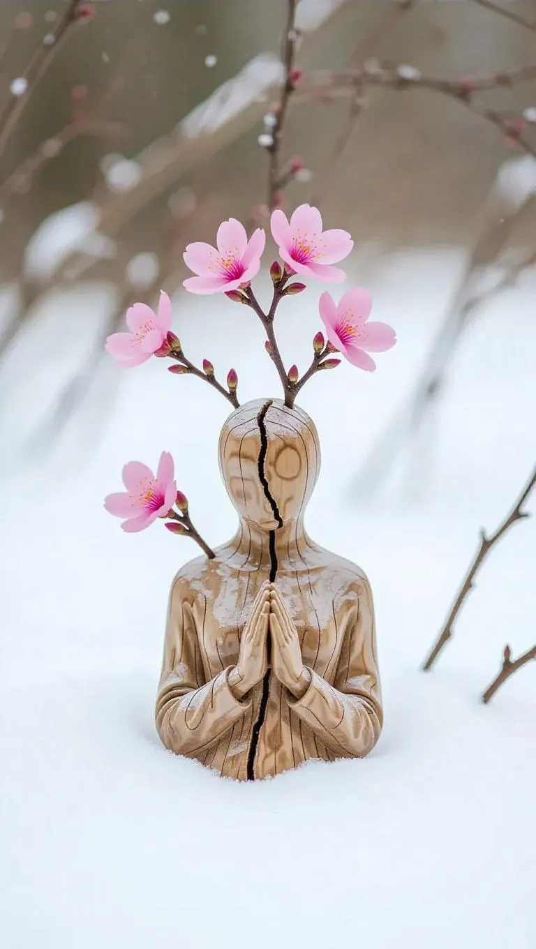 A melted wooden figurine in the snow with pink flowers emerging from the cooled surface, symbolizing rebirth and renewal, the delicate petals contrasting with the hardened wood, creating a serene and poetic scene of life after destruction.