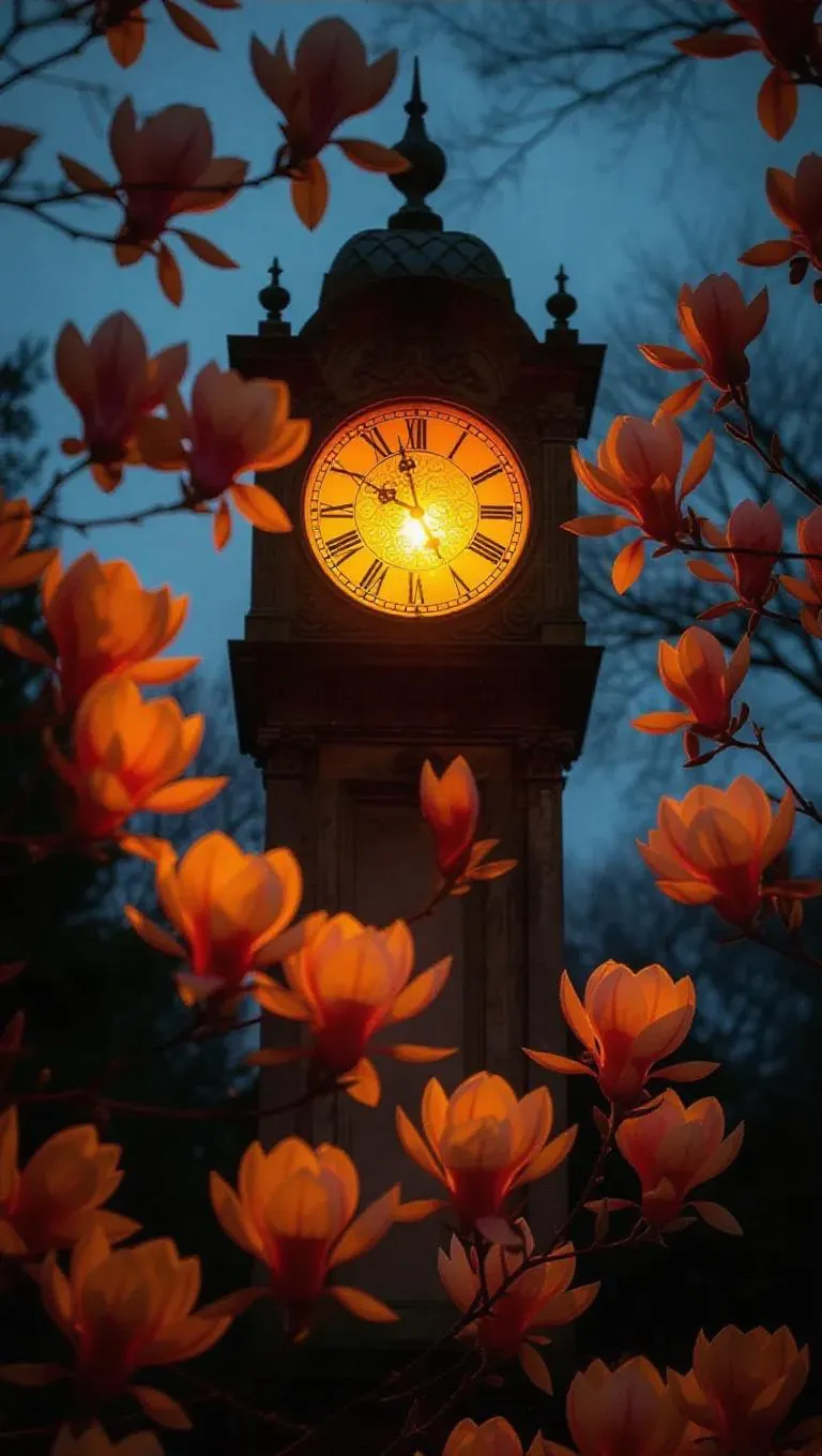 A stately, worn clock tower, glowing with a bright orange radiance from its damaged face, entwined with fragrant magnolias that rise alongside it and flourish at its foot, creating a romantic, warm ambiance.