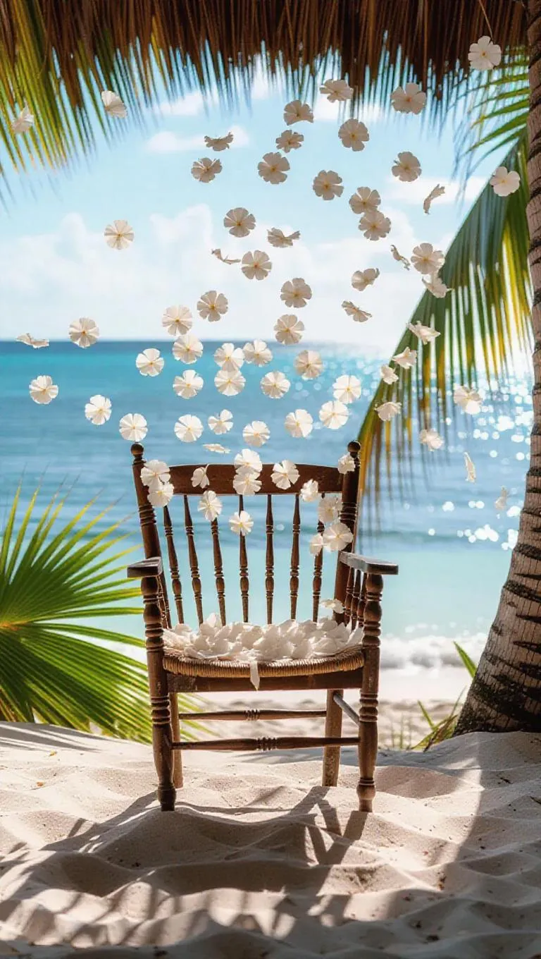 A chair set in a quiet coastal area, its wooden composition eroded, with many palm fronds sprouting from within, petals fluttering in the breeze, creating a surreal and enchanting scene.