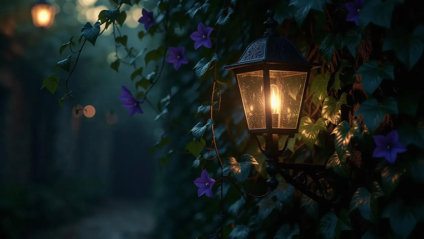 A cracked, weather-beaten streetlamp, emanating a flickering, pale light, engulfed by creeping ivy that spirals around it and peaks in small purple flowers, creating a mysterious, enchanted vibe