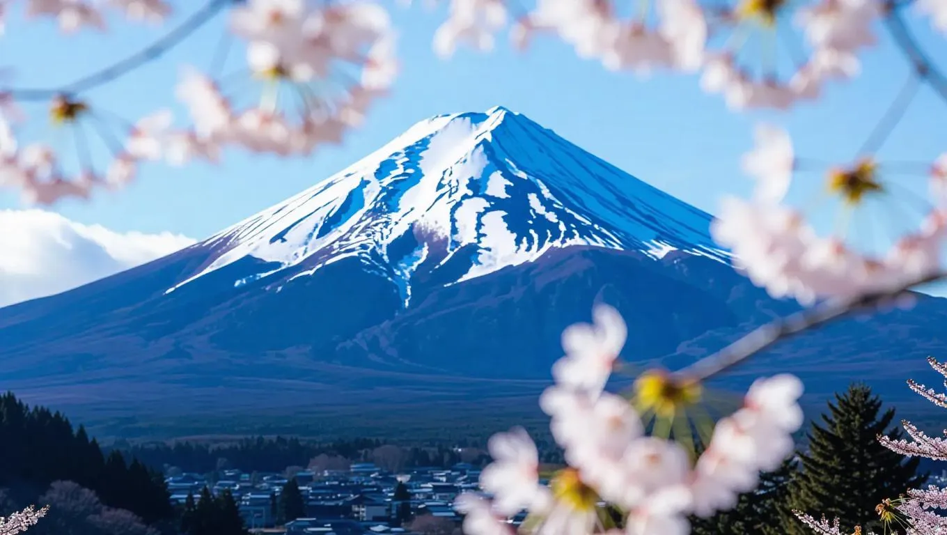 An artistic close-up of Mount Fuji, its snow-capped peak transformed into a delicate sea of white cherry blossoms. The iconic mountain shape remains, but the summit is now a subtle, floral haven. Soft spring sunlight gently illuminates the petals, casting a bright, uplifting glow. The atmosphere is hopeful and refreshing, with clear skies enhancing the optimistic, symbolic blend of nature and renewal.