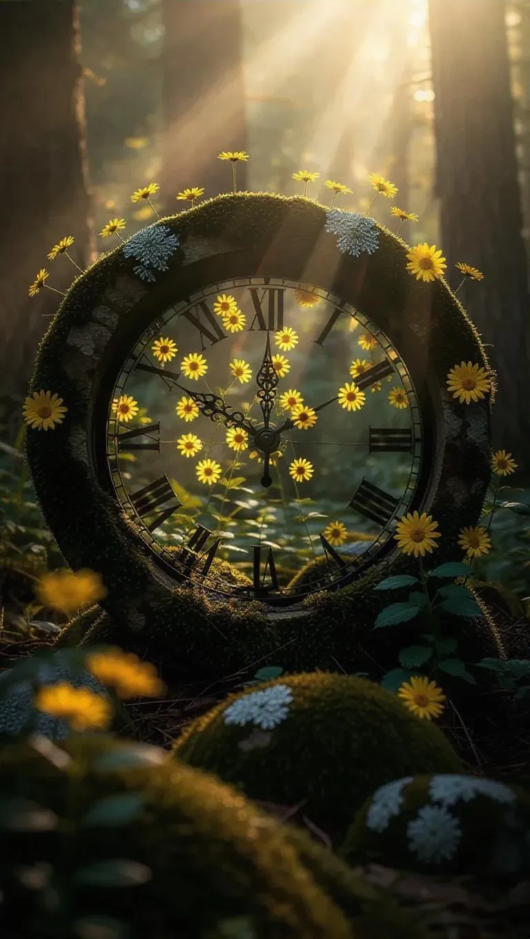 A shattered clock hidden in the vibrant forest, its hands shimmering softly, adorned with yellow daisies, encircled by lichen-covered stones and gentle rays of sunlight breaking through the treetops.
