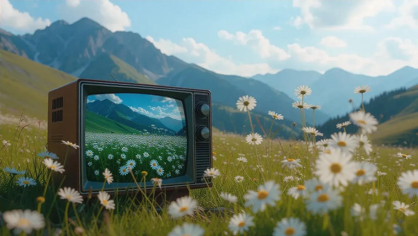 A broken television set nestled in a serene meadow, its screen glowing faintly, blooming with bright daisies, surrounded by rolling hills and a tranquil blue sky