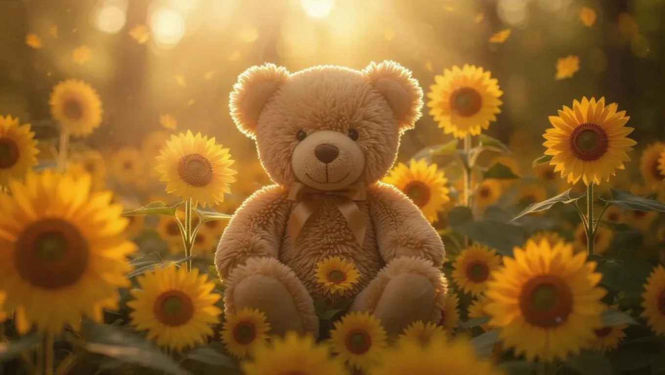 Golden sunflowers bloom around a fully detailed toy bear, creating a whimsical and enchanting scene. Soft petals surround the bear, adding a touch of magic and fairy tale charm.