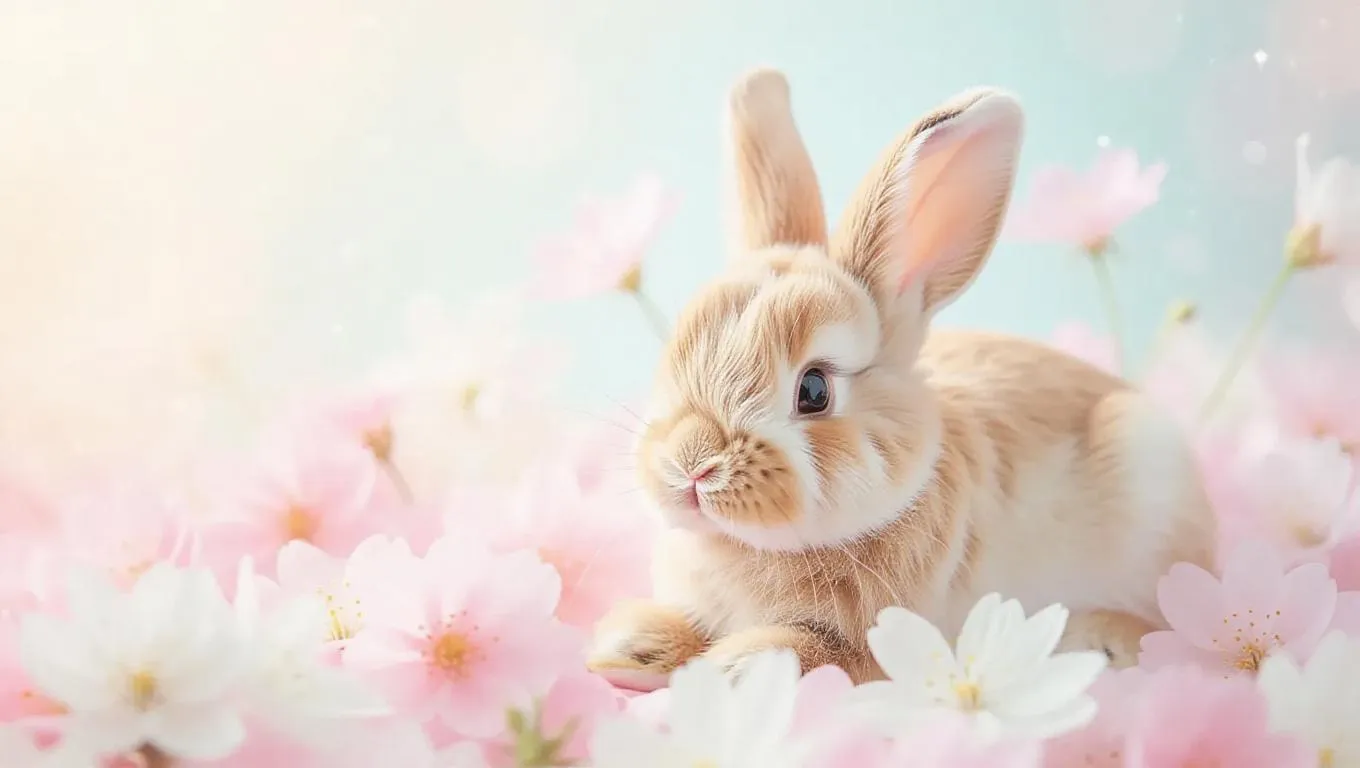 pastel cute blossoms surround a fully detailed plush bunny, creating a whimsical and enchanting scene. Soft petals surround the bunny, adding a touch of magic and fairy tale charm.
