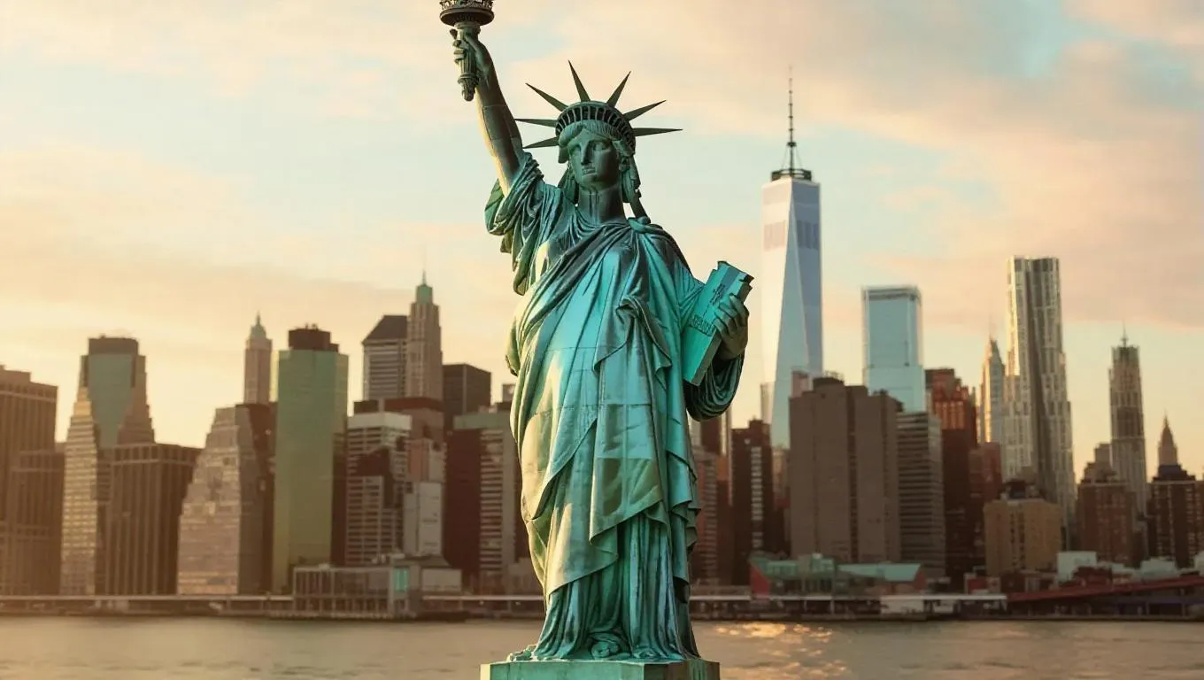 The Statue of Liberty, dressed in a traditional dress from the 1800s, stands majestically against an old-fashioned city backdrop, symbolizing tradition and heritage