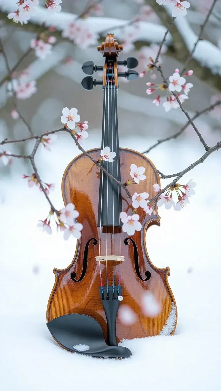 A weathered violin lying in a snowy winter landscape, its wooden body cracked open, with delicate cherry blossoms sprouting from within, petals gently fluttering in the breeze, creating a surreal and enchanting scene.