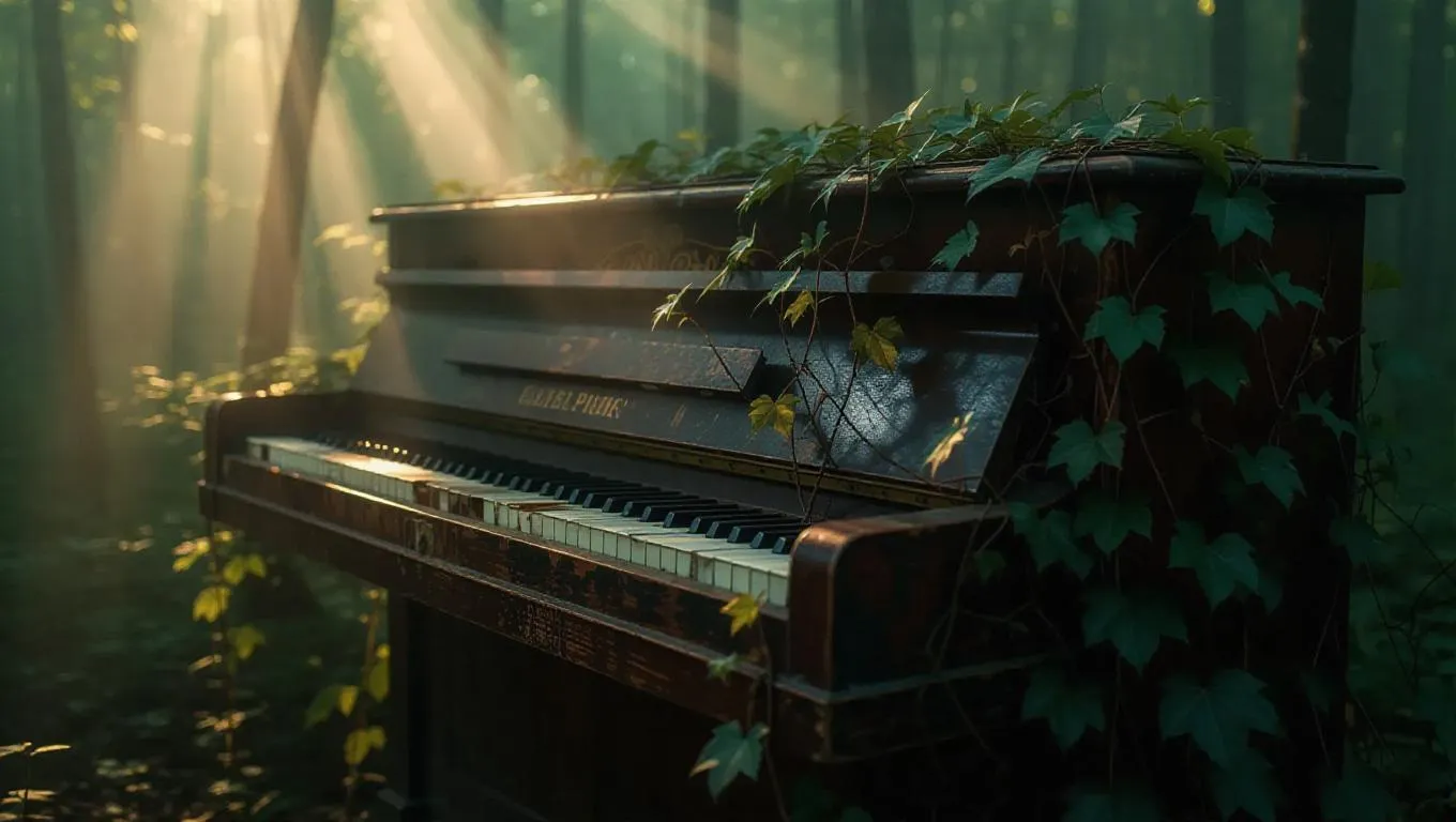 A weathered piano in a misty forest, keys missing and intertwined with creeping vines, creating a surreal blend of decay and renewal, with sunlight streaming through tree branches, casting colorful patterns on the ivories and foliage