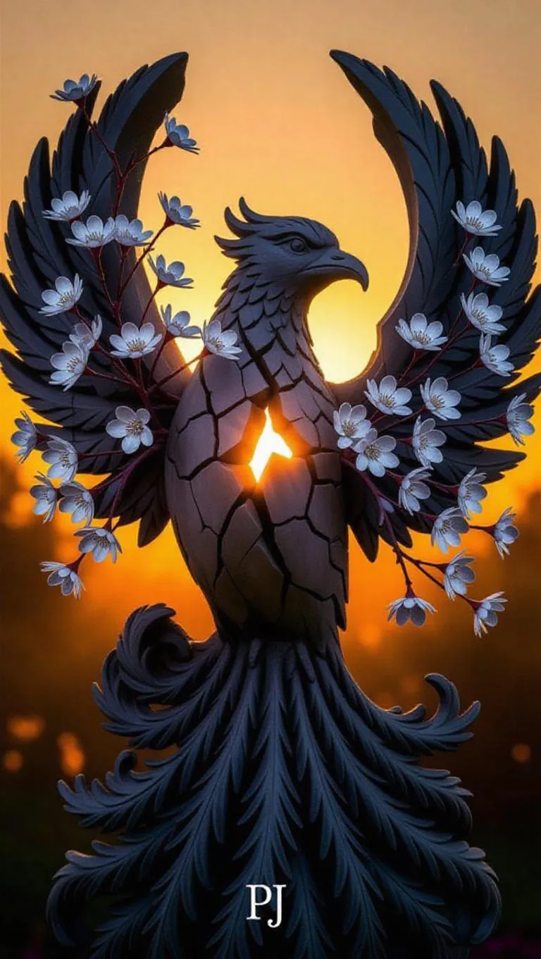 A weathered and broken stone sculpture of a phoenix, its surface cracked and fragmented, exuding a sense of decay and history. Emerging from the crevices and gaps are delicate silver blossoms, their vibrant petals contrasting sharply with the cold, gray stone. The flowers symbolize resilience and renewal, creating a striking juxtaposition between the brokenness of the sculpture and the beauty of new life. The background is a vibrant golden sunrise, casting warm light across the scene and enhancing the emotional depth. The atmosphere is both hopeful and nostalgic, capturing the duality of destruction and rebirth. The art style is highly detailed and evocative, emphasizing the textures of the stone, the fragility of the flowers, and the interplay of light and shadow.