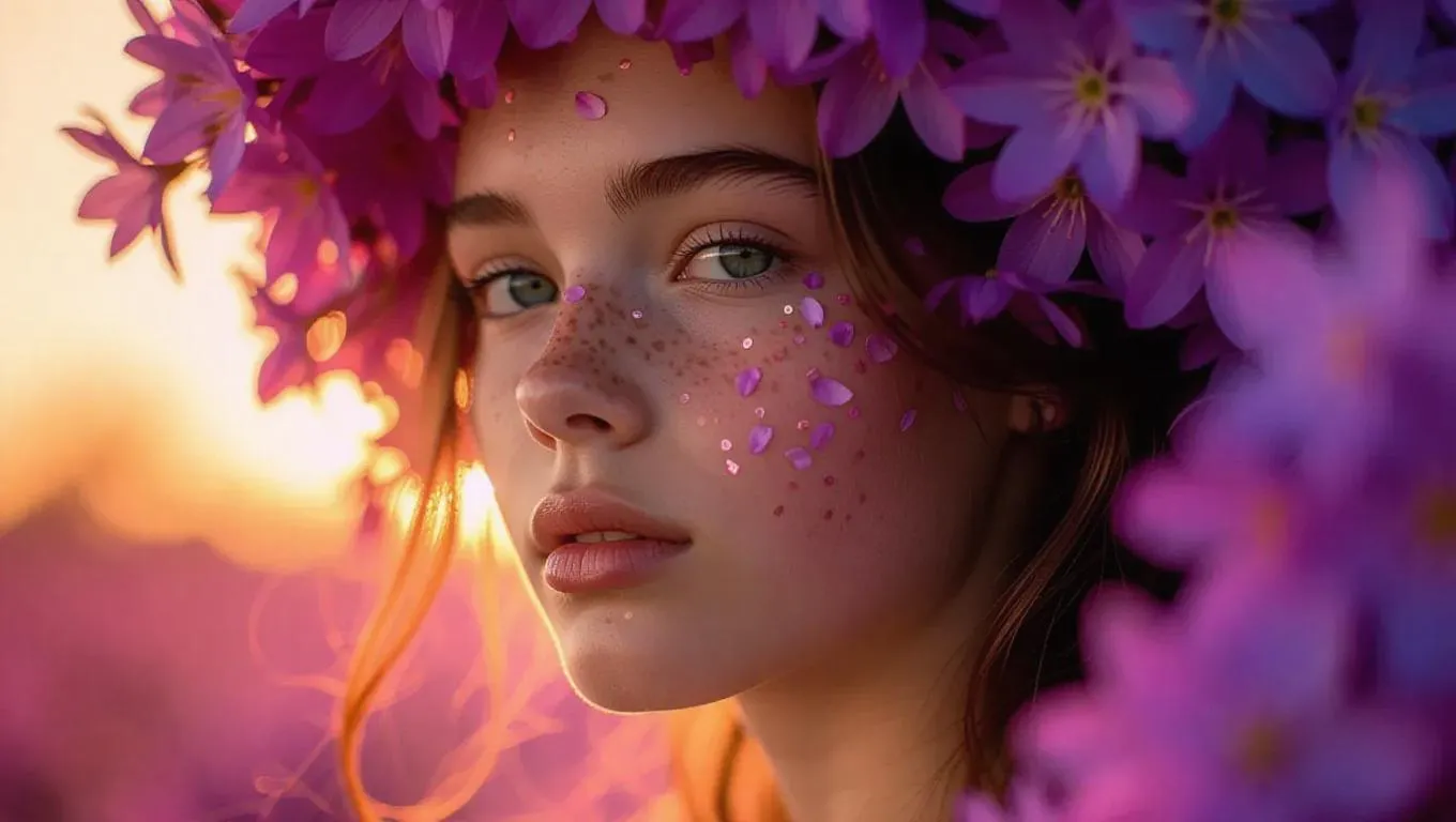 A serene portrait of a teenage girl crafted from delicate petals, enveloped in a radiant halo of soft lavender and bright gold blossoms, set against a dreamlike, sunset backdrop with radiant light, enhancing the ethereal and beautiful.
