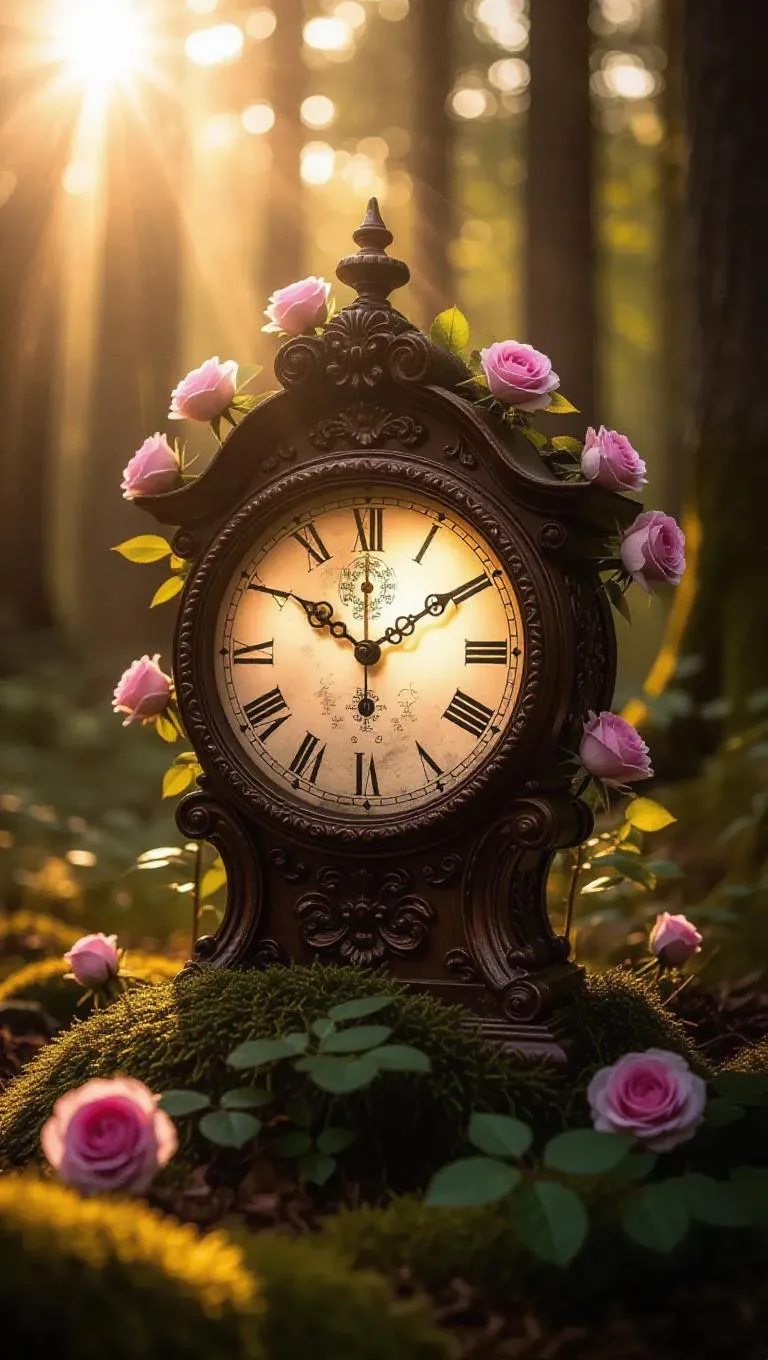 An ancient clock hidden in the tranquil woods, its face flickering with a soft glow, adorned with pink roses, surrounded by mossy memories and warm sunlight streaming down through the tree tops.