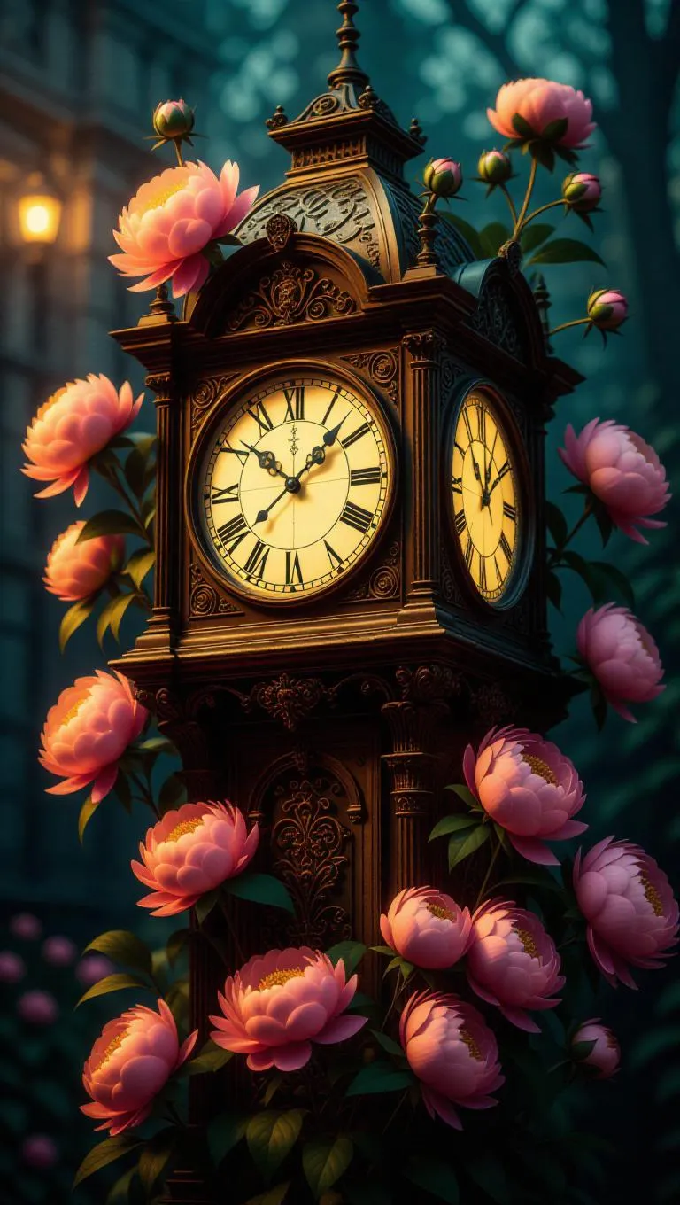 A romantic, dilapidated clock tower, glowing with a brilliant gold light from its cracked face, entwined with lush peonies that stretch up its sides and burst from the ground, creating a lively, vigorous ambiance.