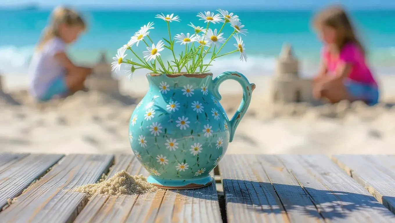 A cracked porcelain vase adorned with tiny daisies sprouting from its rim and handle, gently resting on a weathered wooden table by the beach, where children are building sandcastles nearby.