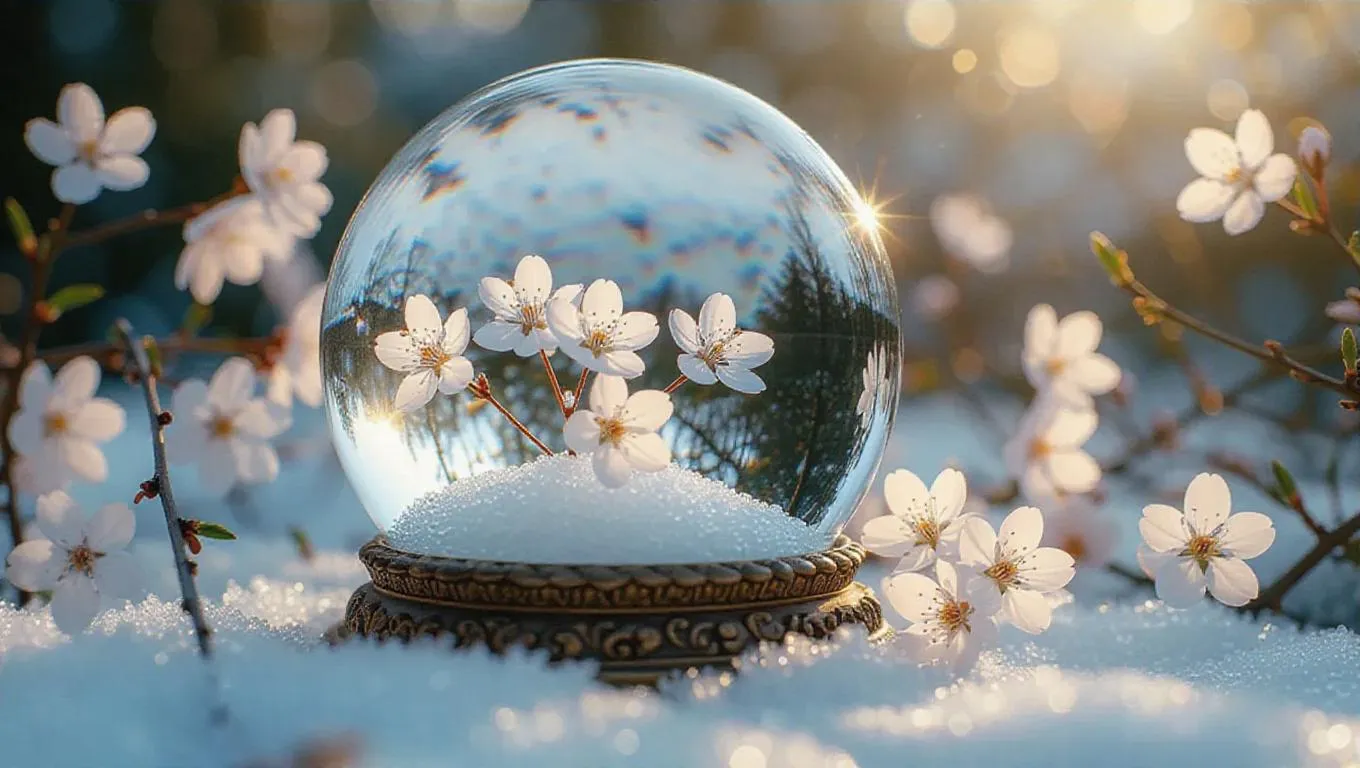 A snow globe cracked open, but instead of water, soft spring flowers flow gently from within