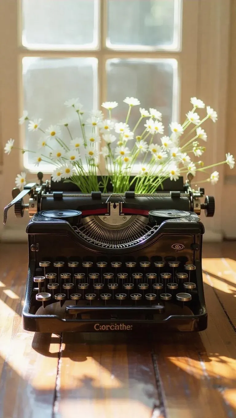 An antique typewriter with delicate buttercup flowers emerging from the keys and carriage, creating a charming blend of vintage charm and natural beauty. The typewriter sits on a polished wood floor, surrounded by soft, muted sunlight filtering through windows, enhancing the peaceful and dreamy atmosphere.
