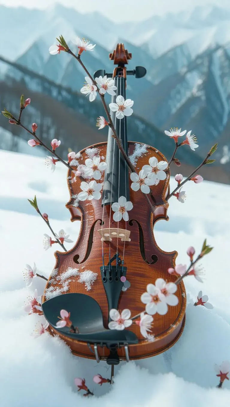 A weathered violin lying on a snowy mountaintop, its wooden body cracked open, with delicate cherry blossoms sprouting from within, petals gently fluttering in the breeze, creating a surreal and enchanting scene